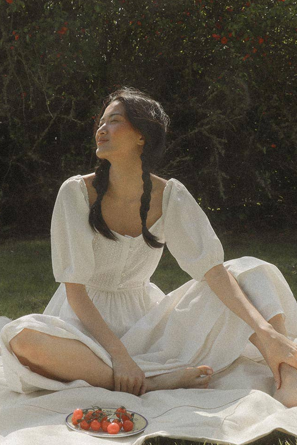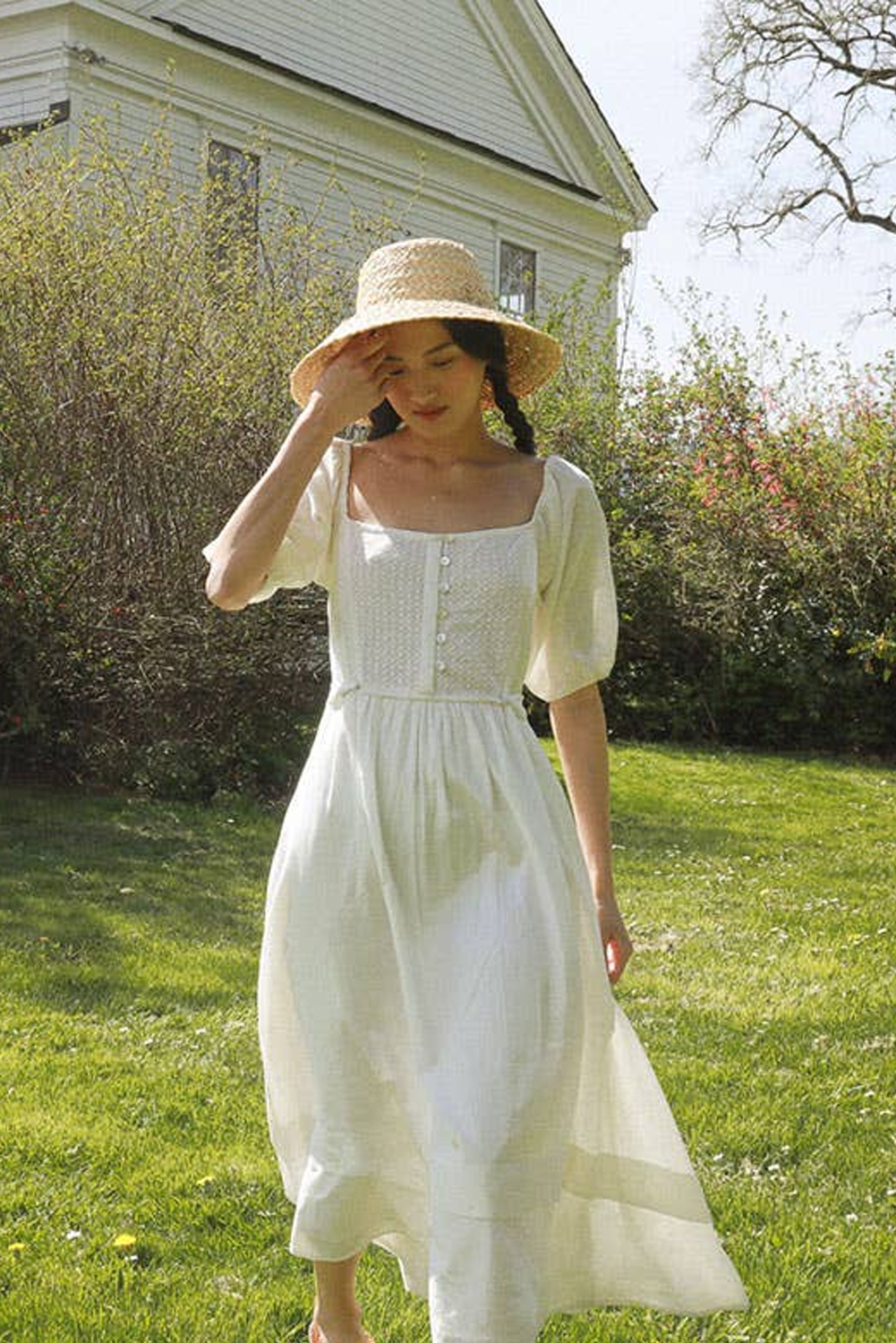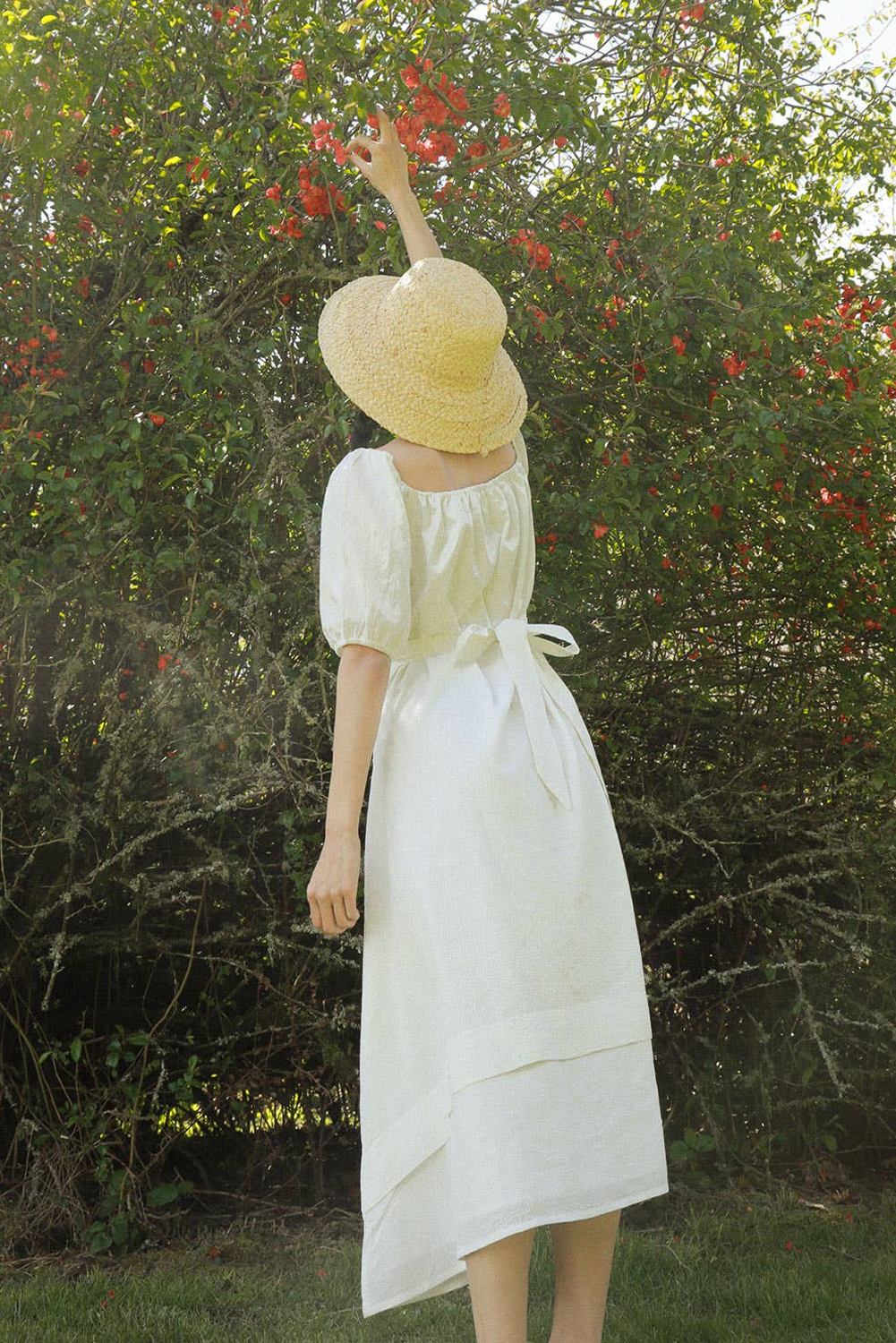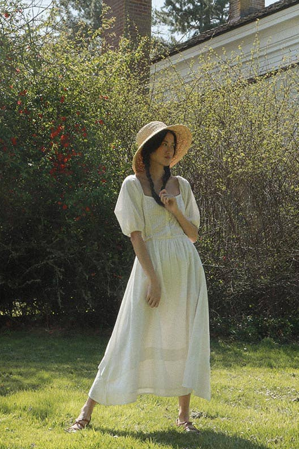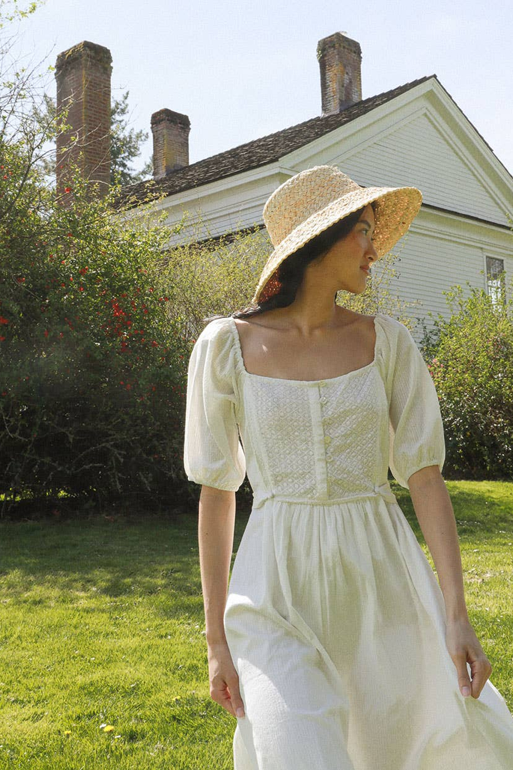 The Luzon Dress is a loose-fitting relaxed fit a-line midi dress made in a soft striped cotton gauze featuring a squared neckline with functional buttons down lace panel bodice, above the elbow length puff sleeves, and removable sash that attaches with lace covered buttons at the waist.